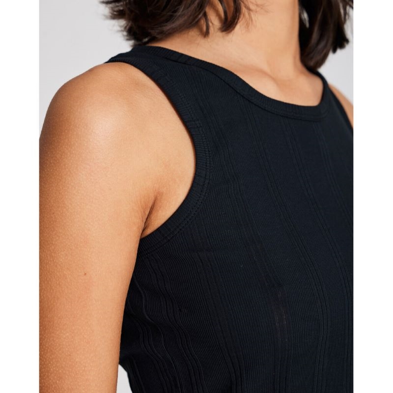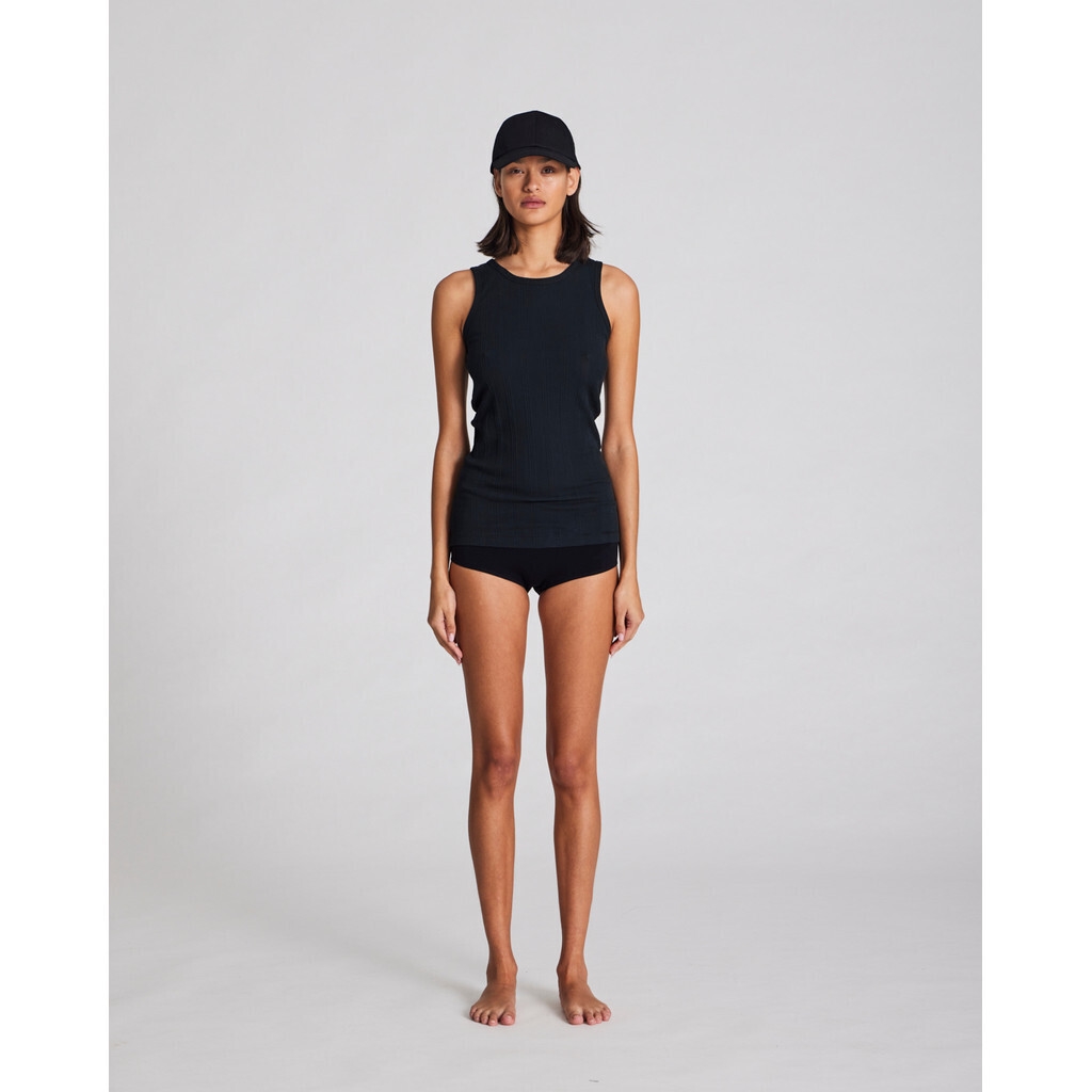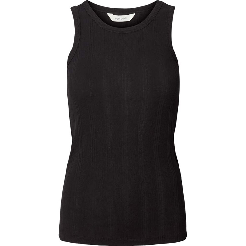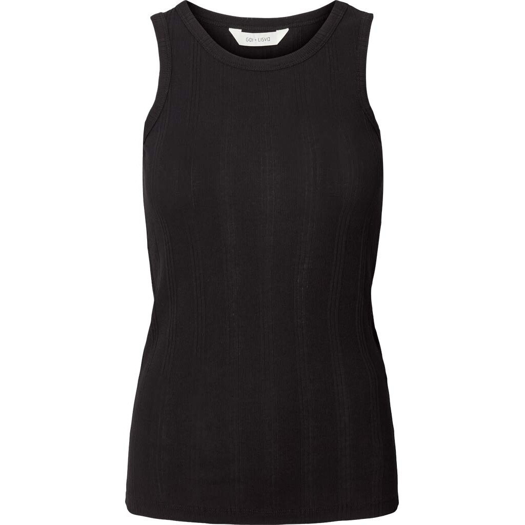 Alberte ribbstickad topp från Gai+Lisva i svart. Alberte är ett supergott mjukt ribbstickat linne med rund halsringning. Alberte linne är en del av Gai+Lisva FOREVER BASIC-kollektionen. Modellen på bilden är 174cm och bär storlek S.