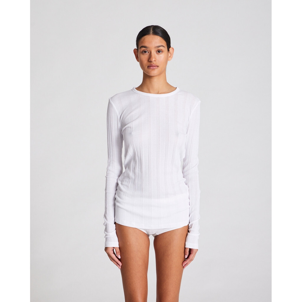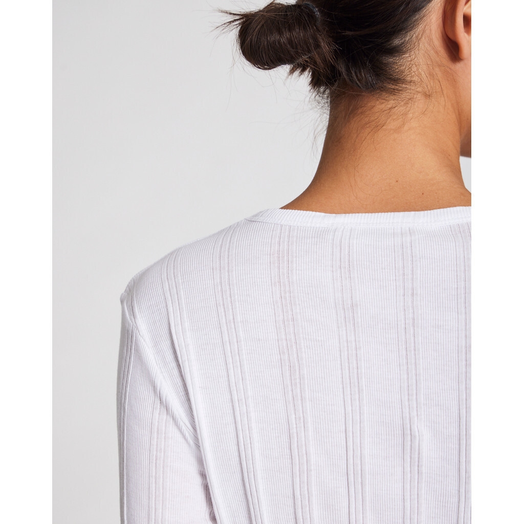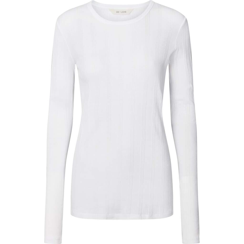 Thyra L/S topp från Gai+Lisva i vit. Thyra är en superläcker mjuk ribbad blus med rund halsringning, långa ärmar och slimmad passform. Thyra-blusen är en del av Gai+Lisva FOREVER BASIC-kollektionen. Modellen på bilden är 174cm och bär storlek S.