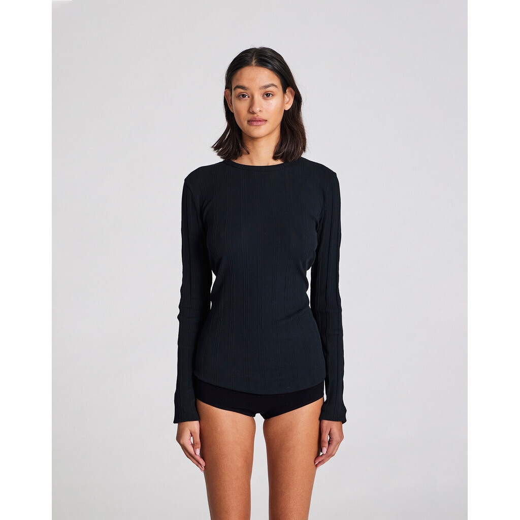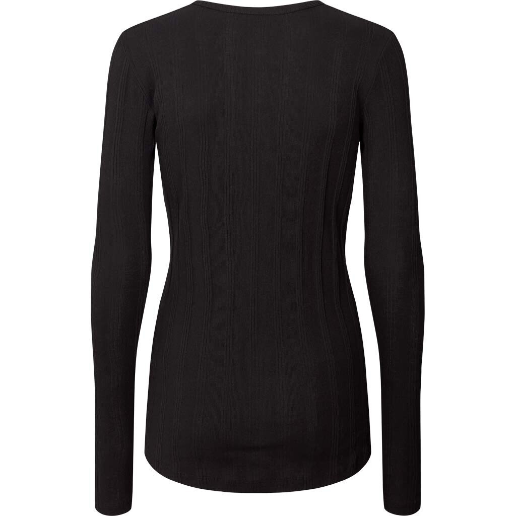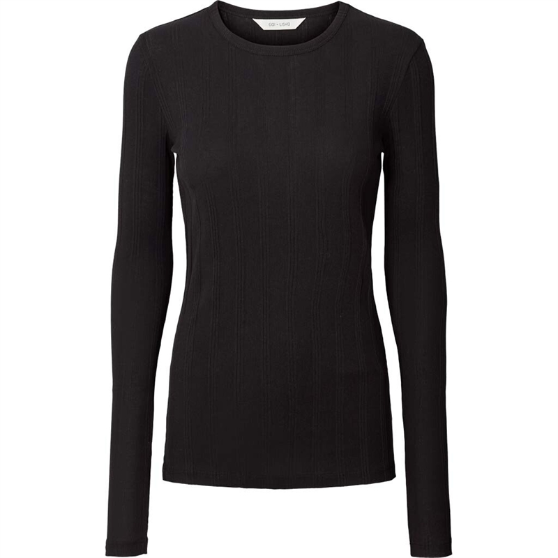 Thyra L/S topp från Gai+Lisva i svart. Thyra är en superläcker mjuk ribbad blus med rund halsringning, långa ärmar och slimmad passform. Thyra-blusen är en del av Gai+Lisva FOREVER BASIC-kollektionen. Modellen på bilden är 174cm och bär storlek S.