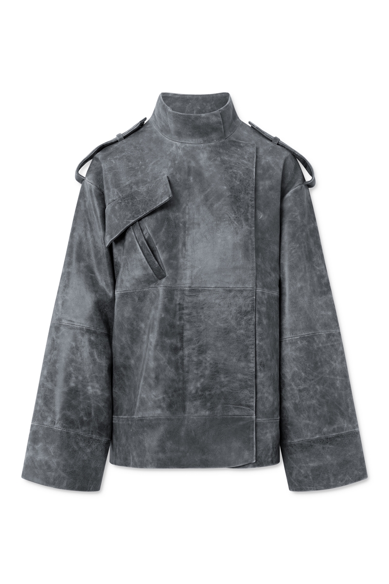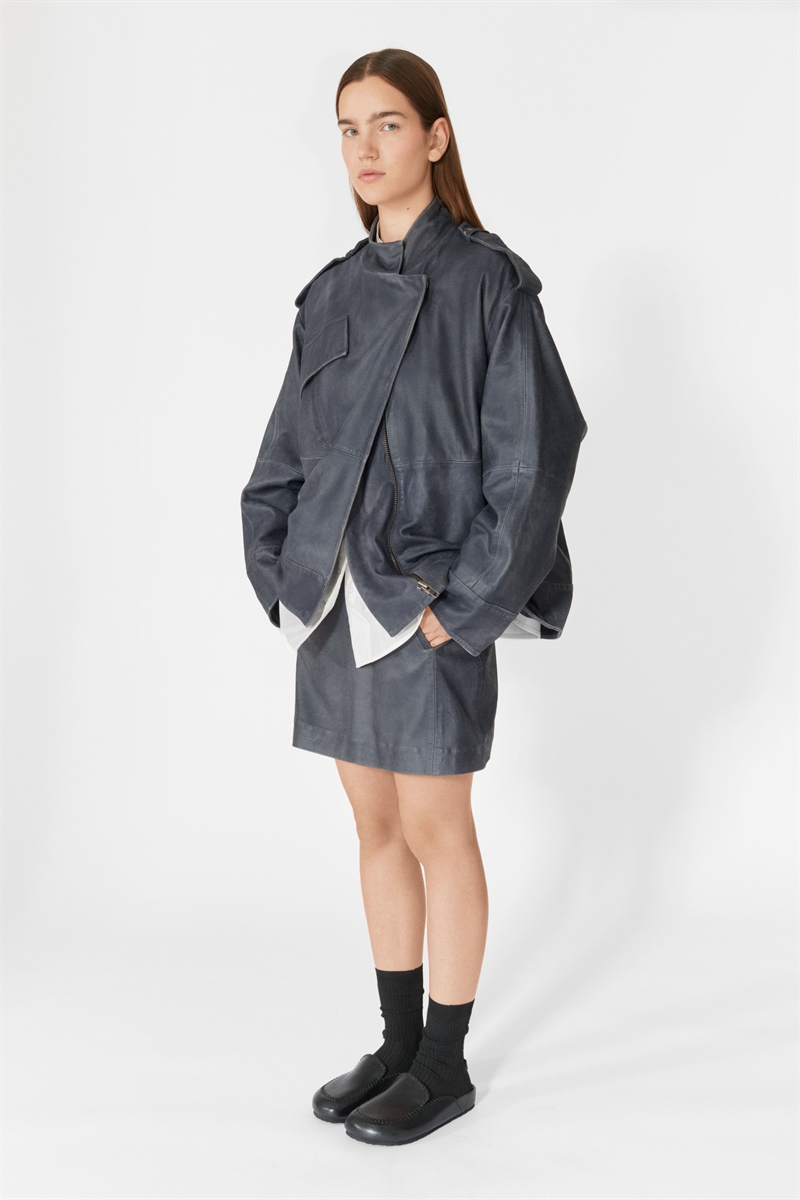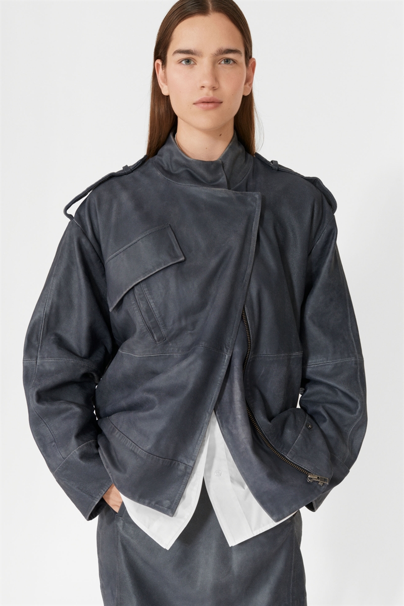 Lovechild Devonna bikerjacka i skinn, med sned bröstficka, hög krage, sidfickor och axelstopp med tryckknappar. Cool med ett par jeans, en vit t-shirt, ett par sneakers, den perfekta vardagslooken.